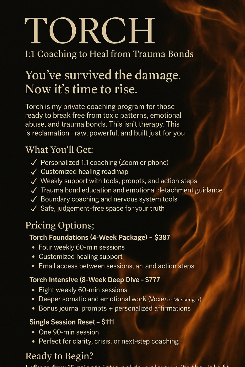 Today, Ginger offers more than her words — she offers Torch, a 1:1 coaching space for those navigating the dark aftermath of trauma bonds and emotional abuse. Her work is dedicated to anyone who’s ever been gaslit, discarded, silenced, or told they were “too much.”